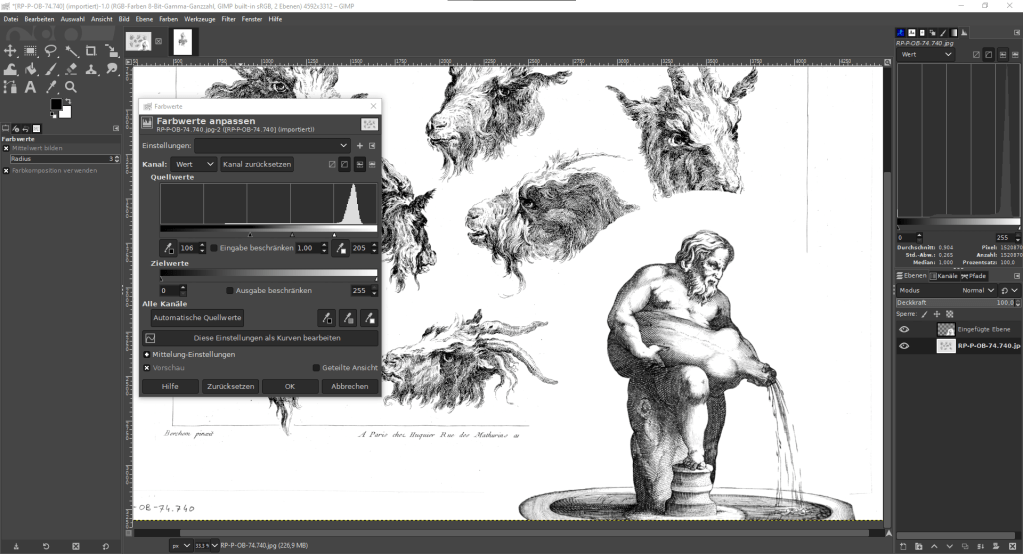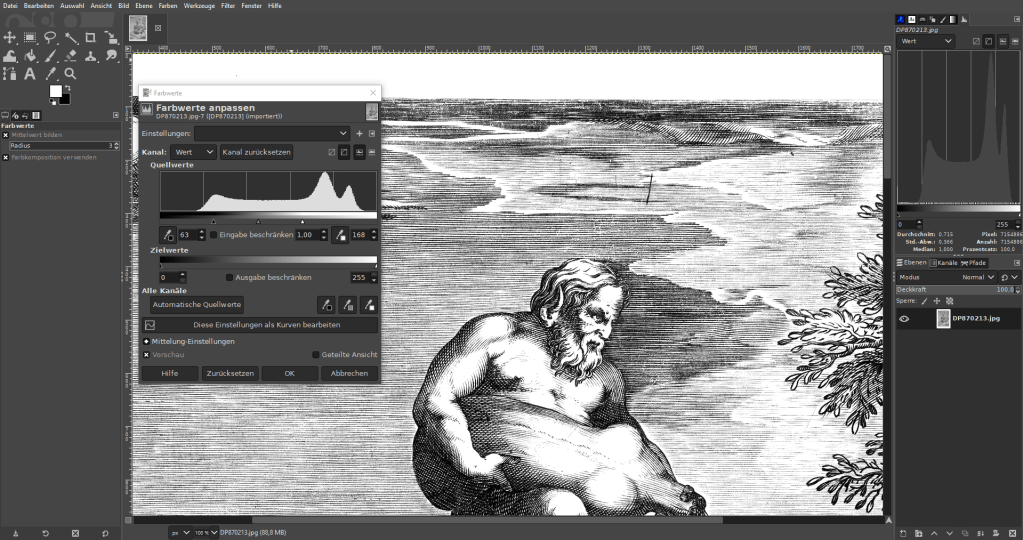 Ich beginne mit dem Brunnen. Das Bild des schwarzweißen Drucks ist farbig gescannt und man sieht, dass das Papier eine gelblich-bräunliche Färbung hat. Für meinen Zweck möchte ich ein Bild in schwarzweiß, also wandle ich es über Farben -> Entsättigen… zunächst in Graustufen um. Als nächstes passe ich die Farbwerte über Farben -> Werte… an.