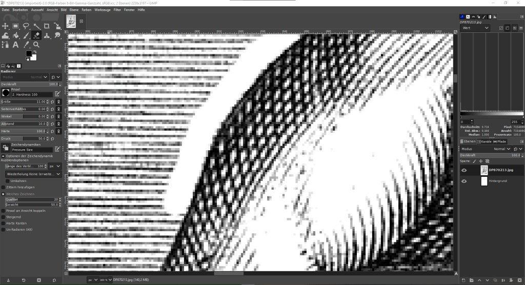 Nun kann ich das Bild exportieren. Wenn ich den weißen Hintergrund unsichtbar schalte und das Bild als .png-Datei exportiere, erhalte ich ein transparentes Bild, dass ich auf einen neuen Hintergrund einfügen kann. Oder ich exportiere es so, wie es ist, mit weißem Hintergrund.