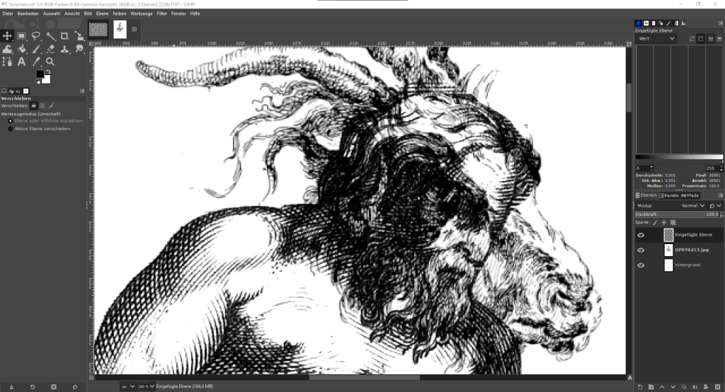 Das Bild der Ziegenköpfe bearbeite ich auf die gleiche Weise. Ich wandle es in Graustufen um und kopiere dann den Brunnen neben den Ziegenkopf, den ich verwenden will. So kann ich die Intensität der schwarzen Linien der beiden Bilder vergleichen (am Ende muss ich trotzdem nochmal nachjustieren, weil sich die Stärke der Linien verändert, wenn ich den Ziegenkopf auf die Größe des Brunnens anpasse).