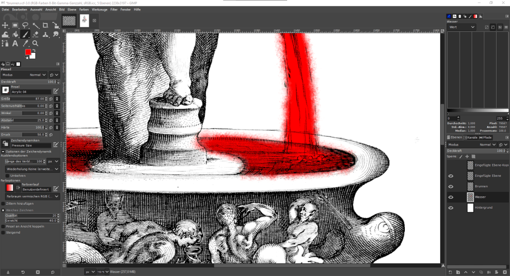 Ich füge einen weißen Hintergrund ein und zwischen die Hintergrund- und die Statuen-Ebene eine transparente Ebene für die rote Farbe. Nun wähle ich einen Pinsel aus und färbe die gewünschten Bereiche rot. Mir gefällt es, wenn die Farbe des Wassers im Brunnen etwas über die Ränder geht. Ich könnte hier aber auch mit einem Radierer auf der Ebene der roten Farbe einmal um den Brunnenrand fahren, um die Farbe genau auf den Wasserbereich zu begrenzen.